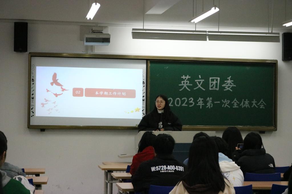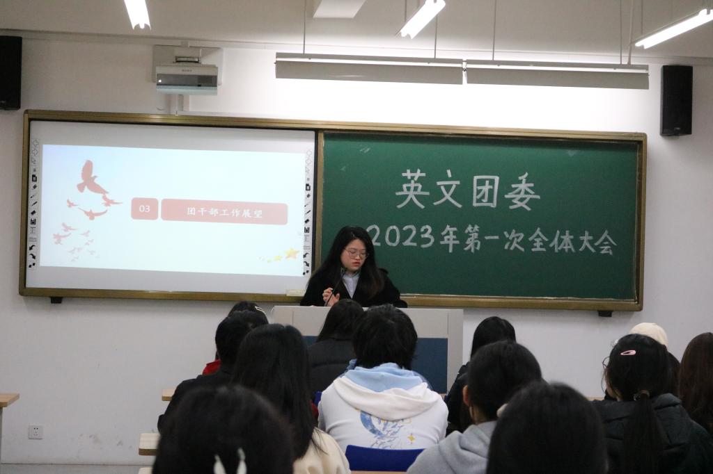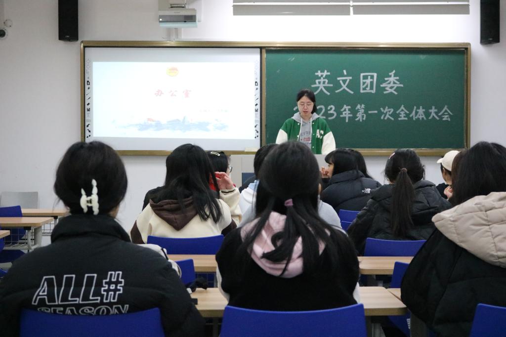 为贯彻落实习近平总书记关于青年工作的重要思想,抓牢做实《关于改革创新高校共青团工作,切实增强思想政治引领实效的若干措施》文件要求,进一步加强学生组织建设,更好地发挥共青团育人优势,3月16日下午,英文学院团委在融A105召开2023年第一次全体大会,团委全体成员参加。大会由团委组织部干事詹璐妍主持。