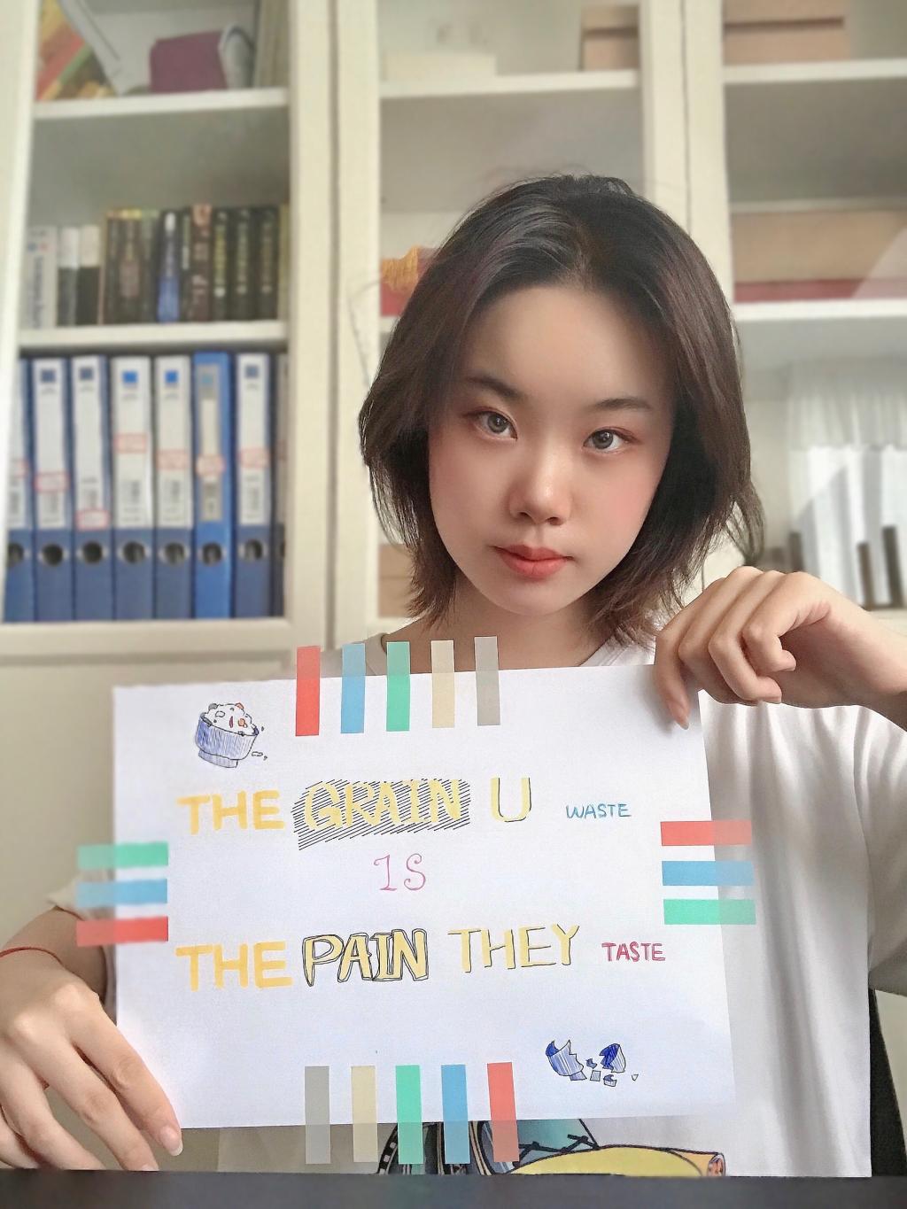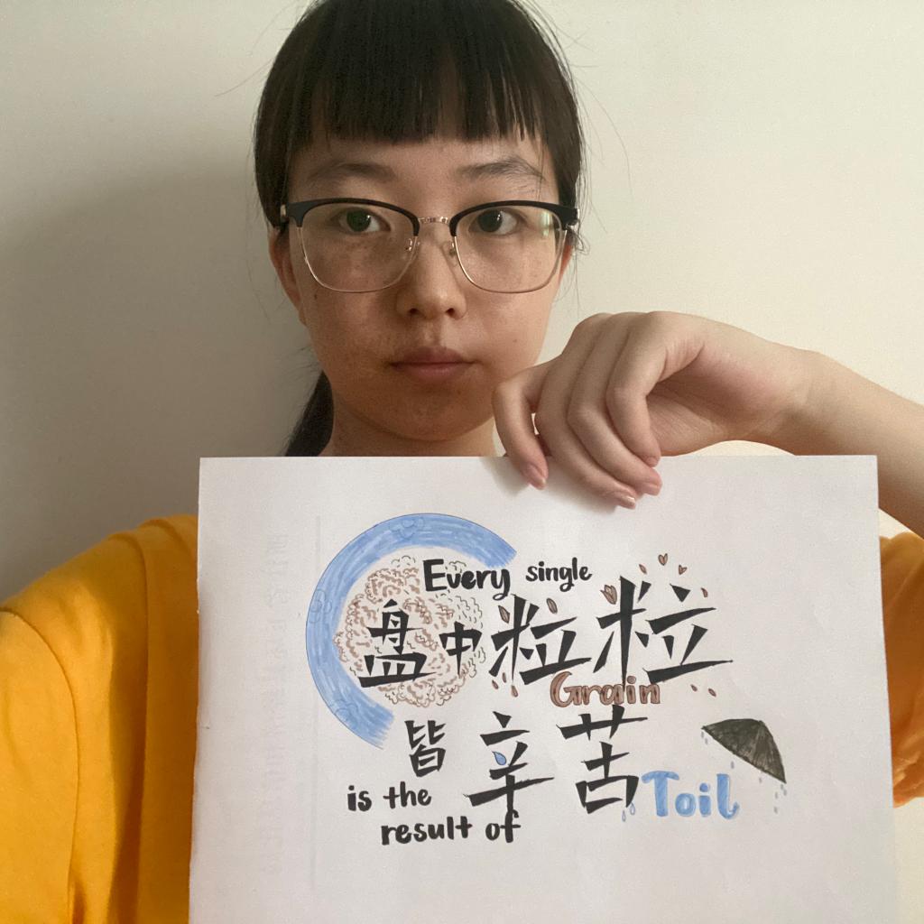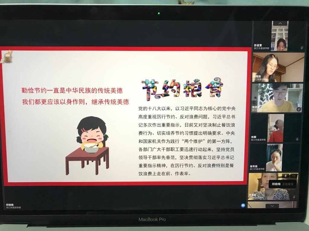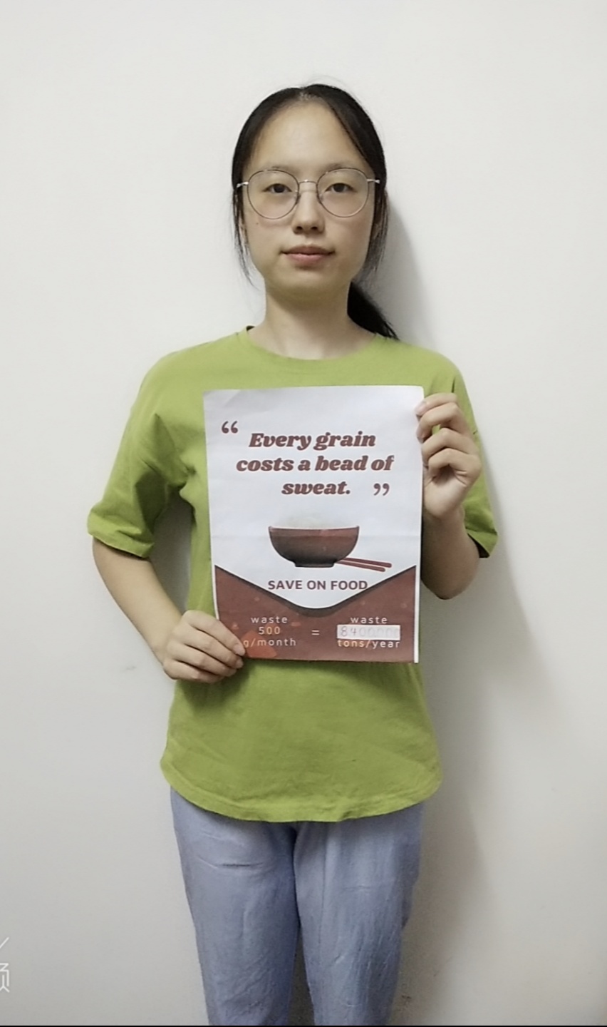 此次活动以线上形式开展,结合翻译系党支部的特色,一方面集体学习习近平总书记关于节约粮食的重要指示,另一方面以双语形式引导学生党员,说标语,表行动。例如学生党员万怡婷以“Food is used to satisfy hunger, not to waste”作为自己的标语;学生党员彭蓝萱以“The grain you waste is the pain they taste”作为自己的标语;学生党员张连成以“One man’s trash is another man’s treasure”作为自己的标语等;学生党员赵新雨以“Grain in each dish is hard”作为自己的标语;学生党员张月欢以“Every grain costs a bead of sweat”作为自己的标语;学生党员罗琛以“Every single grain is the result of toil”作为自己的标语等。