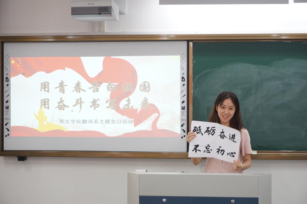为庆祝中华人民共和国成立70周年,激励学生党员增强家国情怀,激发学生党员的责任担当。近日,英文学院翻译系学生党支部开展“青春告白祖国 奋斗书写未来”主题党日活动,展示新时代青年与国家共奋进的爱国情和报国志。