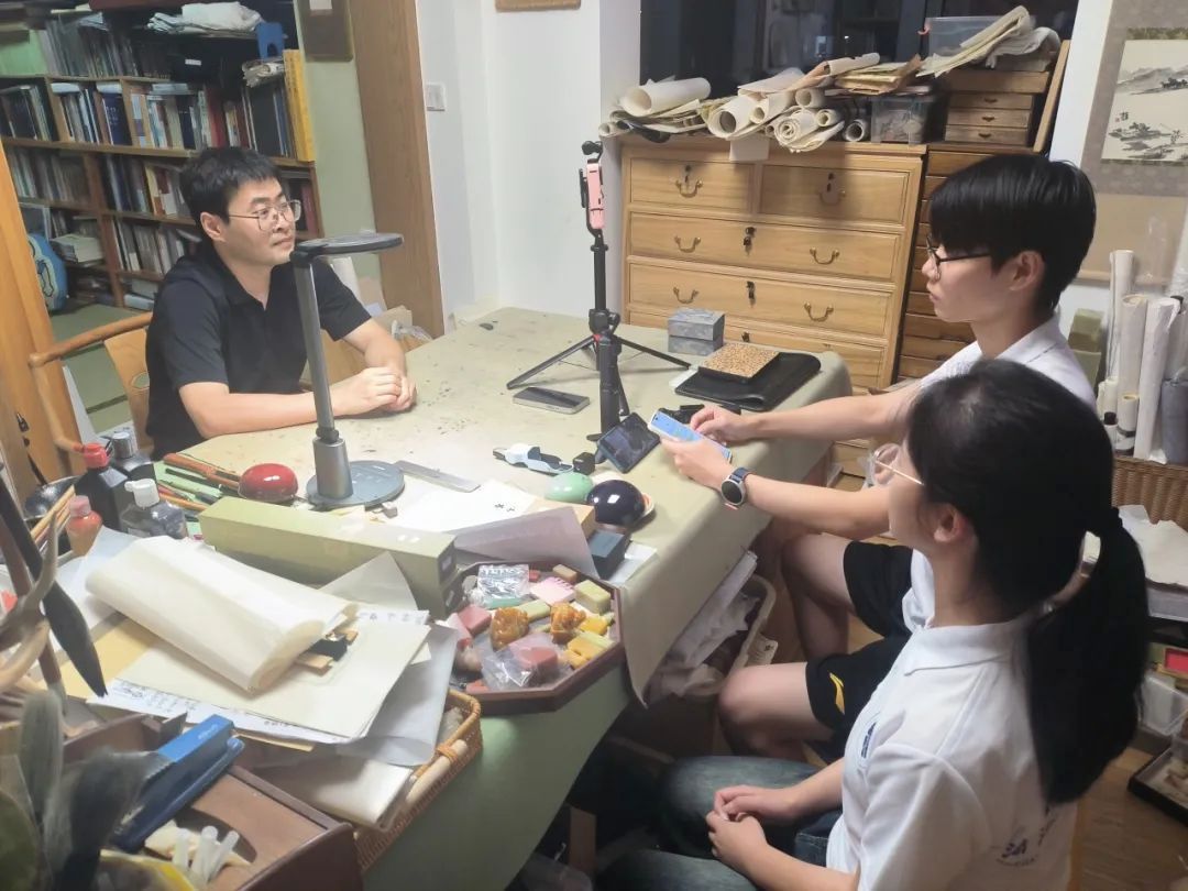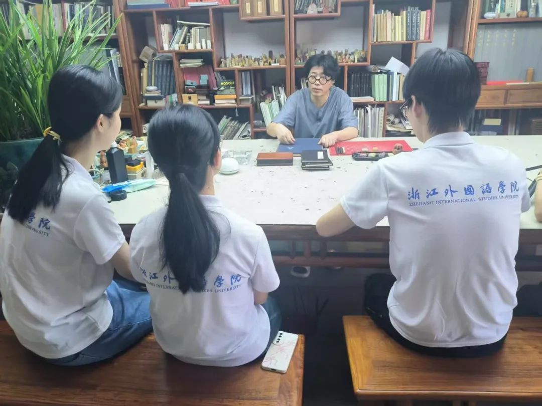 在实践前期,团队成员就与西泠印社社员进行了深入交流。他们专访了书法篆刻家钮利刚,工作室里,钮利钢展示了精湛的篆刻技艺,分享了“人生如篆刻,要常做减法”的感悟;谈及传播,他强调,不能只做传播,要让艺术根基深扎土壤。他建议从非文字图形篆刻切入,但不可回避汉字文化,“避谈汉字,传播便会得不偿失”。