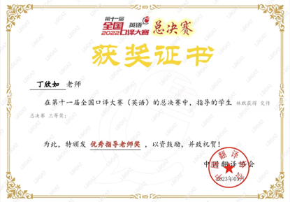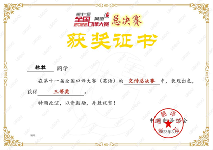 近日,第十一届全国口译大赛(英语)总决赛落下帷幕。经过激烈的角逐,最终英文学院19级口译班林敢凭借扎实的双语功底在交传总决赛中获得三等奖,指导老师丁欣如荣获优秀指导老师奖。