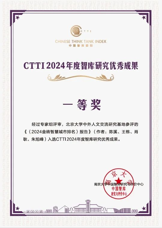 近日,英文学院特聘教授陈溪牵头完成的《〈2024 阿盟智慧城市排名〉报告》《〈2024 金砖智慧城市排名〉报告》分获 CTTI(中国智库索引)2024年度智库研究优秀成果特等奖、一等奖。此前,陈溪教授于去年牵头完成的《2023亚洲智慧城市排名》和《2023二十国集团智慧城市排名》也荣获CTTI 2023年度智库优秀成果特等奖。