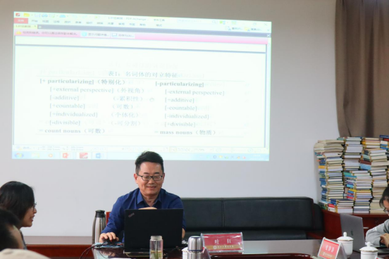 在教师汇报分享环节,国家社科基金项目负责人叶狂针对当前名词体研究面临的难题、相关现象的解释、名词体视角的解释力进行了分享,引发了与会人员的热烈讨论,也为其他老师提供了研究问题的新视角。