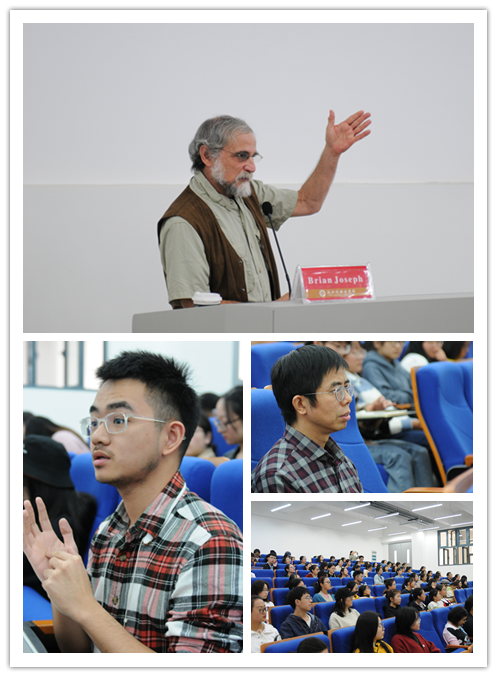 Joseph教授通过让在座师生思考“time dimension(时间维度)”之于语言和生活中的作用,引出研究语言的变化及其变化的原因。他以典型的诗歌、音乐、小说、视觉艺术等为例,指出人类与时间关系的不稳定性,引发在座师生对“时间和语言发展”问题的思考。之后,他以山和沙漠的变化及自己所在大学的变化为例,生动形象地解释了Synchrony(同步性) 与diachrony(历时性) 的区别。之后,他继续和在座师生探讨了语言在历史变化过程中“Variation”与“Change”的关系、“stability”在此过程中的重要性及语言的变化是否改变语言实体的基本本质等问题。