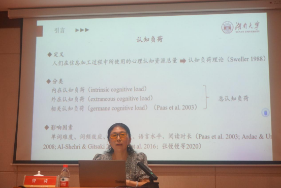 曾涛主要讨论了高、低水平非英语专业学生快速阅读时的眼动模式。她首先对实验仪器、眼动实验的关键术语做了详细介绍;接着呈现了实验设计和实验结果,指出内在认知负荷相较于外在认知负荷在被试完成任务的过程中扮演着更加直观和重要的作用;最后,她还对快读阅读教学给出了具体建议,如阅读课应重视学生图式网络的建构,应灵活运用认知负荷的增减,加强略读等速读策略的训练。