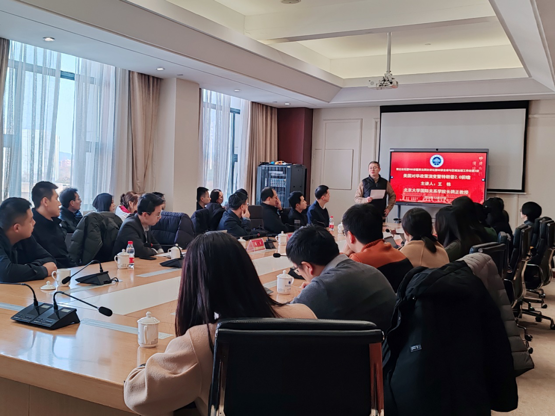 美国研究中心特聘顾问,北京大学社会科学部副部长兼智库办主任、教育部北京大学中外人文交流研究基地执行主任,兼中华美国学会副会长王栋受邀参加浙外博达论坛第980讲暨英文同文讲坛第88讲全球与区域治理工作坊第3讲,以“美国对华政策演变暨特朗普2.0前瞻”为题作讲座,英文学院特聘教授陈溪主持,来自校办、社会合作处等职能部门、英文学院、西语学院、东语学院、文旅学院等学院师生参加。