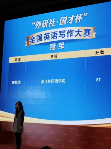近日,2020年“外研社·国才杯”全国英语写作大赛顺利落下帷幕。在英文学院肖奇民老师的精心指导下,我院廖佳欣同学奋力拼搏,过关斩将,从来自全国1200余所高校的13万名选手中脱颖而出,喜获全国英语写作大赛总冠军。