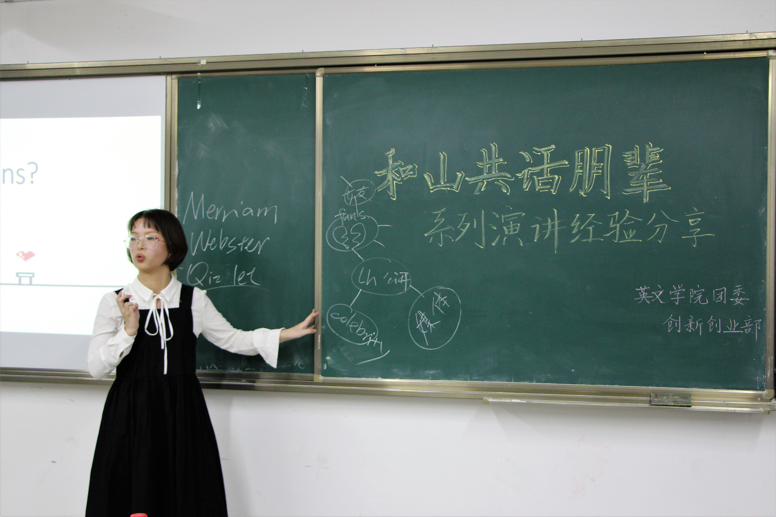10月26日晚和山共话朋辈分享文化沙龙之英语演讲经验分享会开讲。本次分享会邀请了荣获2016年“外研社杯”全国英语演讲大赛浙江省赛区总决赛一等奖的14翻译3班的袁园、2017年蓝天杯比赛二等奖的15翻译3班的包静静以及2017年蓝天杯中获得三等奖16商英2班的马明宇。
