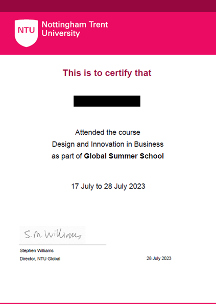 六、夏校毕业会被授予诺丁汉特伦特大学夏校项目证书(证书样本如下图),学生作品将参加夏令营结业展览。