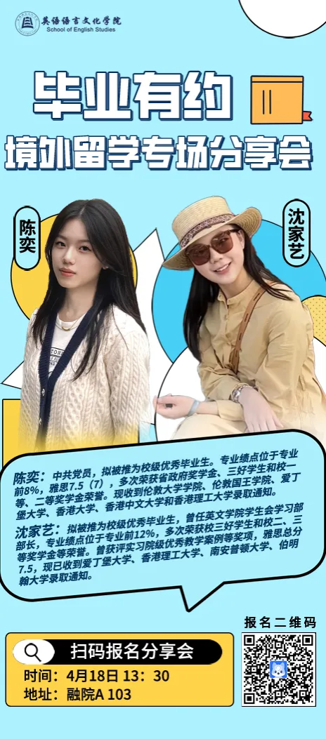 为了帮助大家更全面地了解境外留学相关信息,“毕业有约”系列活动第二期——境外升学专场如期而至。学院邀请了两位斩获多份境外高校offer的学姐为大家解答申请院校过程中的疑难困