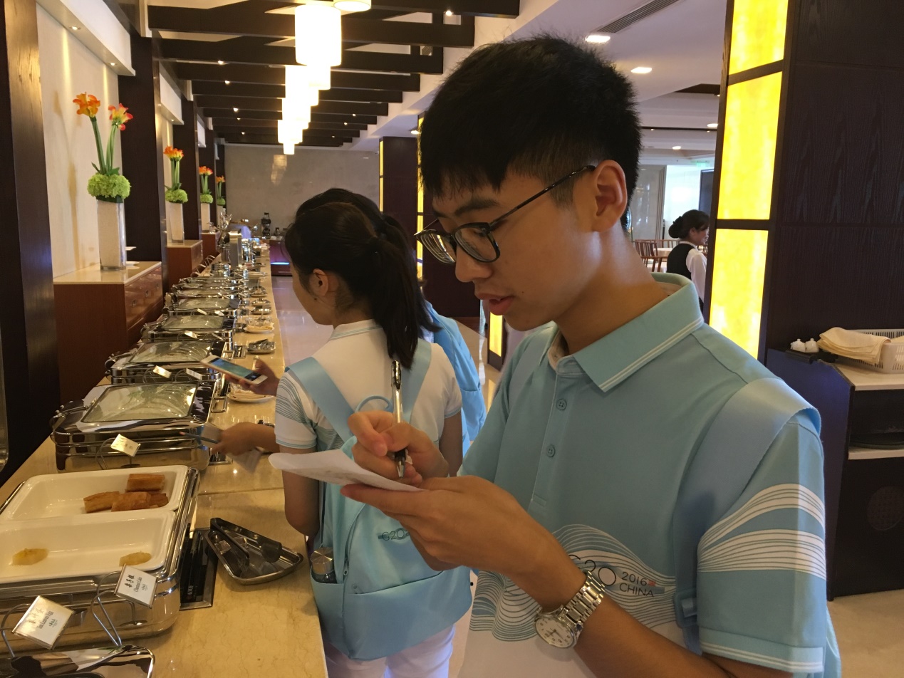 我所分配到的岗位正是服务大家4号晚上在电视机前看到的欢迎晚宴。我的工作是在最靠近领导人们用餐的宴会厅为各国领导人随行人员、外国媒体做翻译指引工作。外国媒体一般问的最多是厕所在哪儿,或是怎么连WiFi,但是外国随行团队则会因为证件权限,通行问题等状况百出。其中令我印象非常深刻的是一位印度官员因为没有通行权限但是一定要跟团队一起,因为语言不通无法沟通,甚至和警卫人员发生了冲突,通过沟通,我慢慢适应了他的口音,让气氛缓和下来才缓解了冲突。尽管晚宴全程都没能直接见到各国领导人,但是很意外的遇到了加拿大总理的女儿,有这段小插曲也让我对志愿服务更有动力,成为了一次难忘的机遇。志愿者的服务就是在坚持任务、锻炼心智中度过的。真的非常激动自己可以服务晚宴,服务G20,让我有幸经历世界级盛会,有幸看到最美的杭州!