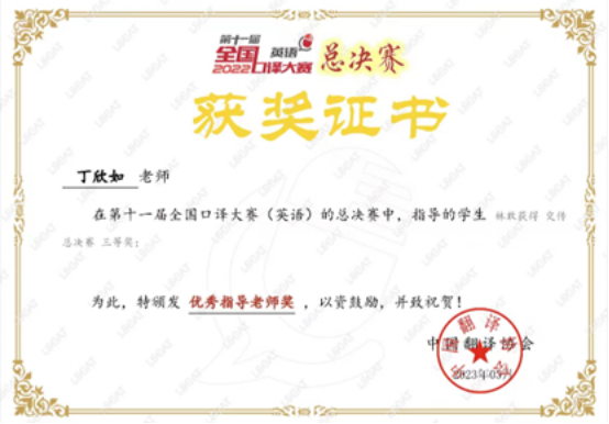 近日,第十一届全国口译大赛(英语)总决赛落下帷幕。经过激烈的角逐,最终英文学院19级口译班林敢凭借扎实的双语功底在交传总决赛中获得三等奖,指导老师丁欣如荣获优秀指导老师奖。