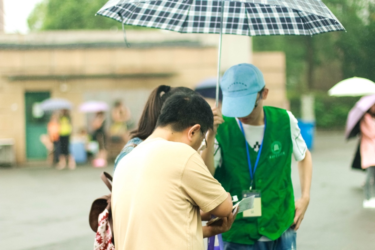 新生接待点,英文学院的辅导员们和大一各班班助们已经早早地开始等待新生们的到来。门口、路上、体育馆等处的志愿者身着绿色小马甲,微笑着为新生和家长指路。