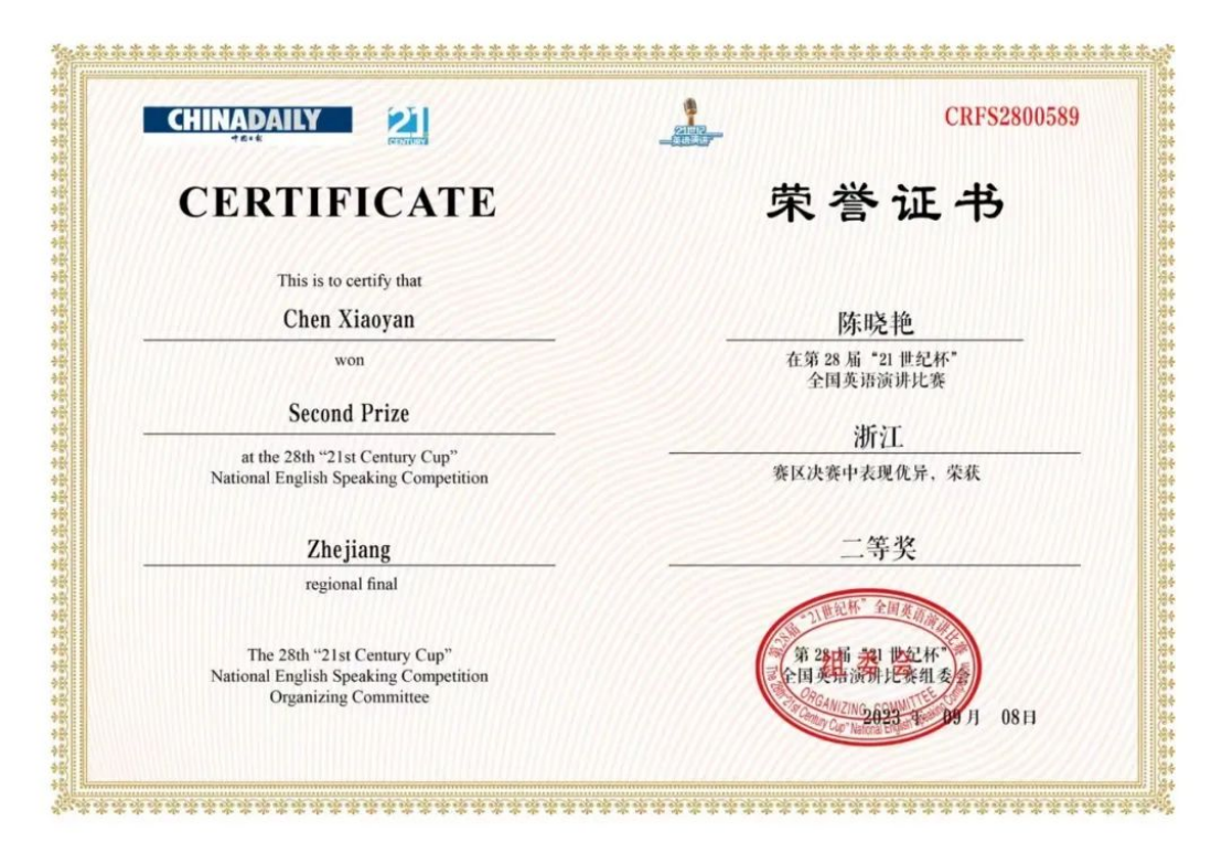 近日,“21世纪杯”全国大学生英语演讲比赛浙江省赛区决赛圆满落下帷幕。在楼翎老师和夏国建老师的悉心指导下,英文学院21英语6班伍桢颖在决赛中获得亚军,并顺利进入全国总决赛!21商英1班陈晓艳在决赛中荣获二等奖!