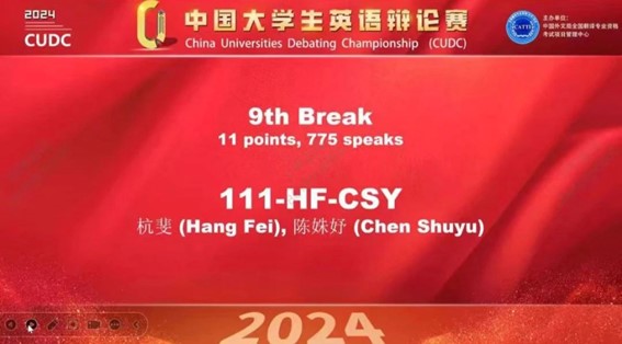 近日,2024“CUDC杯”中国大学生英语辩论赛国赛圆满结束,在楼翎老师的悉心指导下,22级英语(师范)4班杭斐和22级英语(师范)4班陈姝妤经过激烈竞争,取得了全国一等奖的好成绩,并以breaking 第九的成绩晋级全国32强淘汰赛。英文学院21级英语(师范)3班陈婧如和21级英语(师范)4班叶飞扬也稳定发挥,荣获全国二等奖!