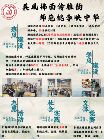 一瓣花朵看似单薄无色,但簇拥一起便成花园绚烂的画卷;一滴水珠看似微不足道,然汇聚起来便成江河澎湃的浪潮。22英师3班是一个团结的班集体,我们如同繁星点点,各自闪耀又彼此照亮。在这里,每一次挑战,都是我们共同成长的阶梯;每一份成就,都凝聚着全班的心血与汗水。22英师3班,是一片希望的田野,我们携手播种希望,共同收获未来,在团结的力量下,让梦想的种子生根发芽,绽放出最耀眼的光芒。