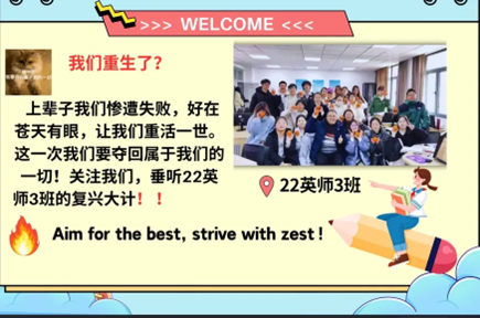 22英师4班是一个学风积极向上,成绩进步明显,社会实践丰富,志愿精神昂扬的班级!我们有亲爱的小慧和环光老师带领,我们有100%的师生互动。未来的22英师4班,更多的国奖,省奖,校奖我们来啦!!!