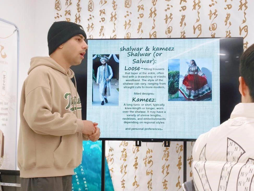 Adil向大家介绍了巴基斯坦的民族传统服饰Salwar和Kameez,他通过一个视频直观地让大家了解了它们的特点——宽松的长裤和束腰外衣,让大家体会了巴基斯坦传统民族服饰的独特魅力。