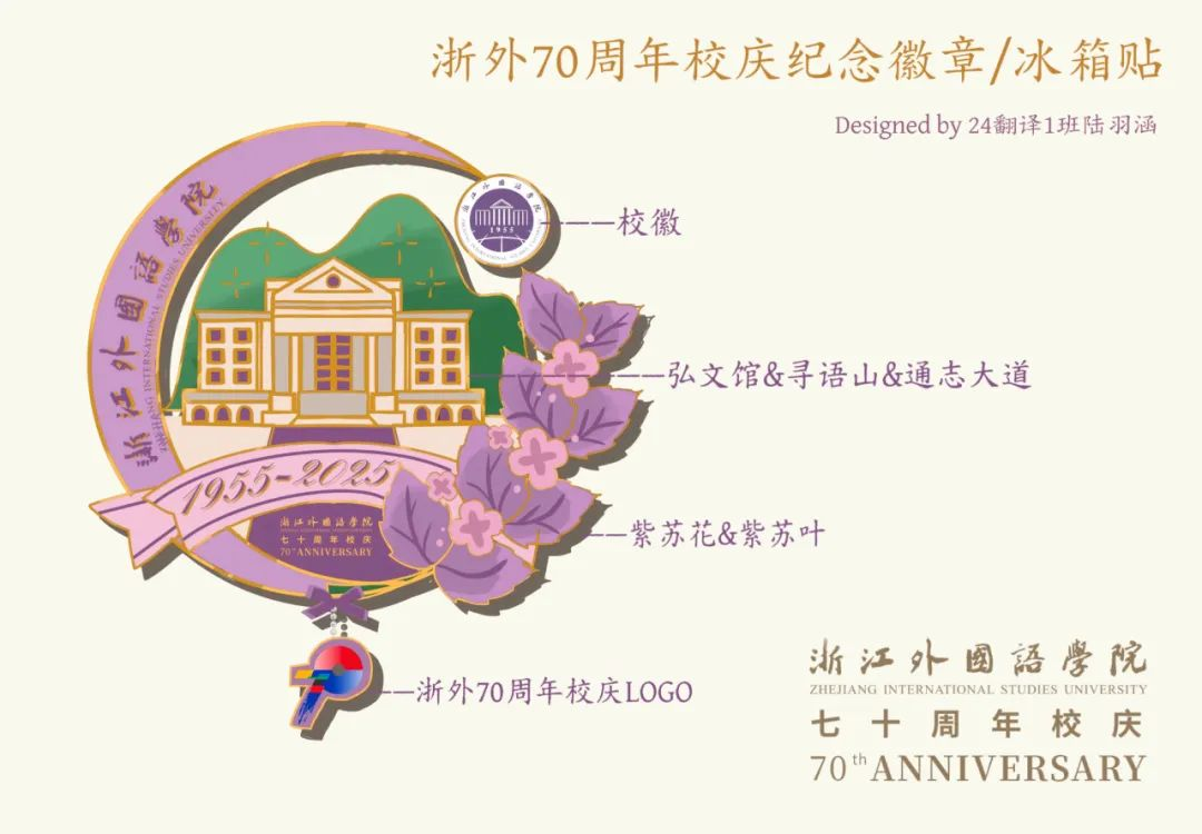 的紫苏花叶为核心意象,结合典雅紫色与烫金工艺,展示浙外青年青春有为、昂扬向上的精神。