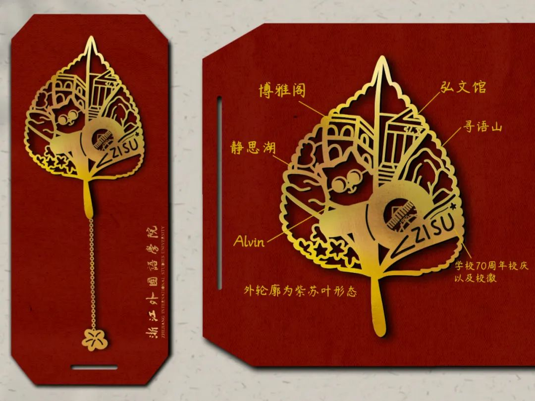 的标志性建筑与地点,如弘文馆,博雅阁,静思湖以及英文学院吉祥物Alvin,充分展现浙外特色和“弘德明毅,博雅通达”的校训。整体书签为金属质感,象征浙外70年的光辉历程。