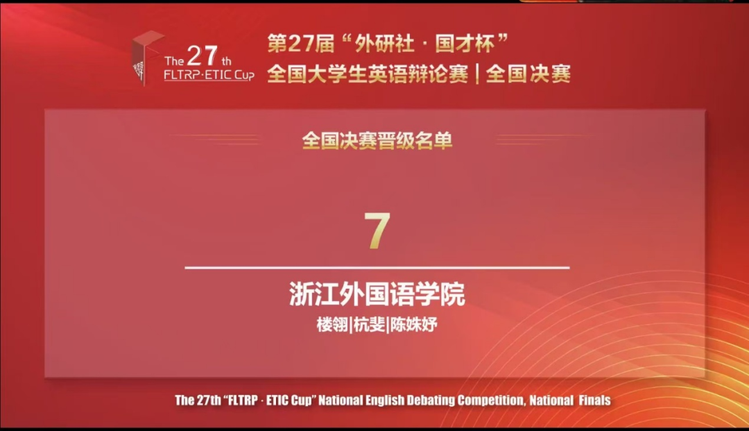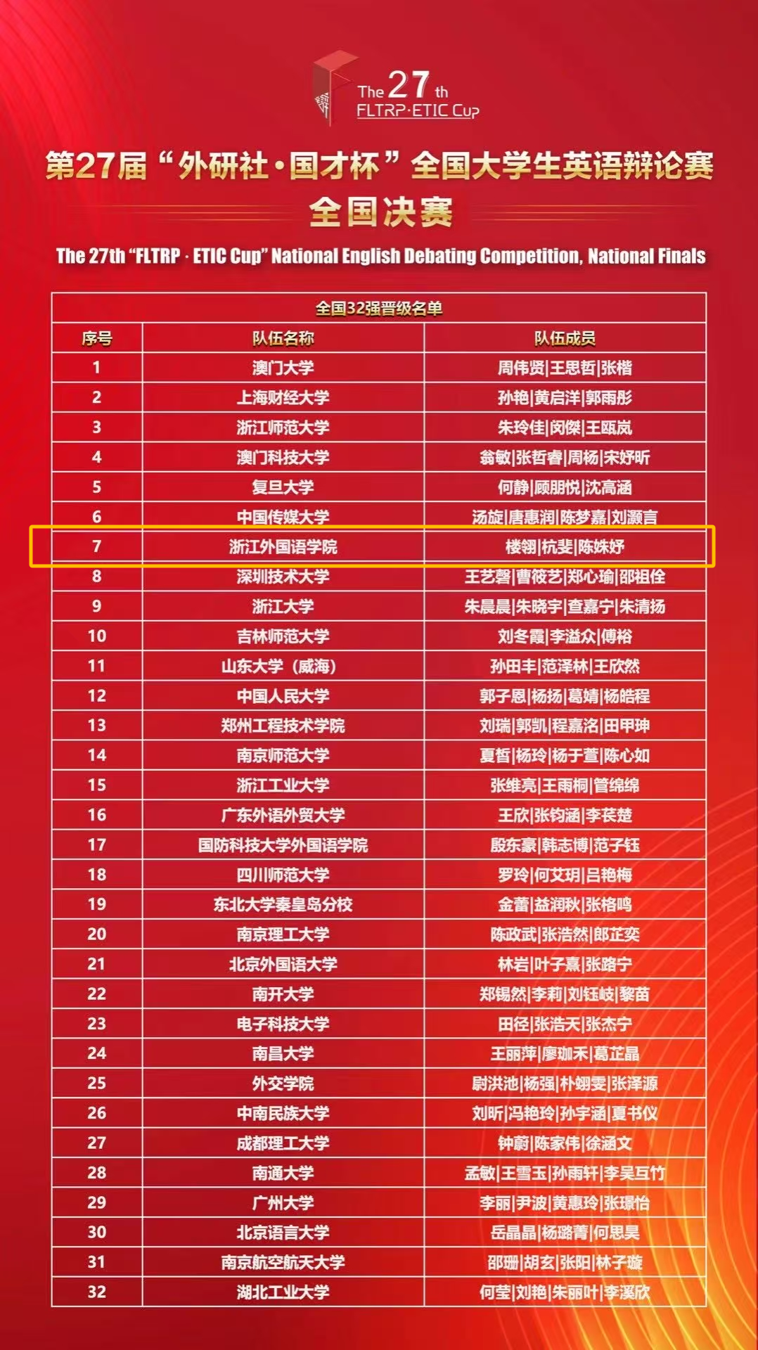 近日,第27届“外研社·国才杯”全国大学生英语辩论赛全国决赛圆满落下帷幕。在楼翎老师的悉心指导下,经过激烈的角逐,英文学院22英语(师范)4班杭斐、22英语7班陈姝妤同学在全国众多参赛队伍中脱颖而出,以breaking第7的优异成绩,荣获国赛金奖,成功入围全国32强冠亚季军总决赛淘汰赛!