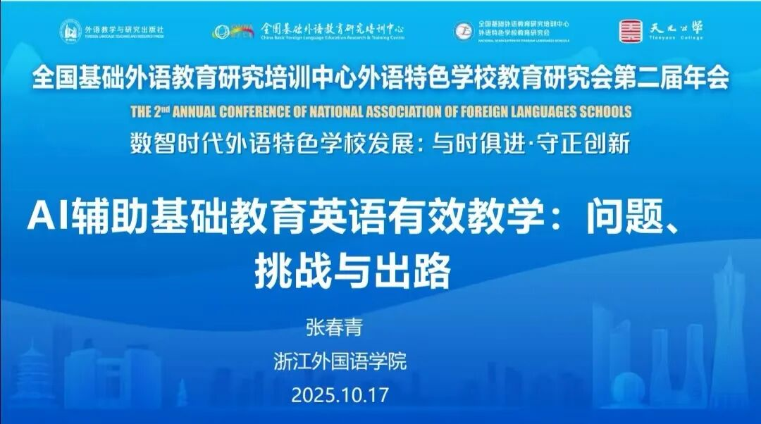 发展:与时俱进・守正创新”,汇聚了全国外语教育领域的专家学者与一线教师,共同探讨外语教育在智能时代的发展路径与实践创新。英文学院教师张春青出席并作题为“AI辅助基础教育英语有效教学:问题、挑战与出路”的专题报告。
