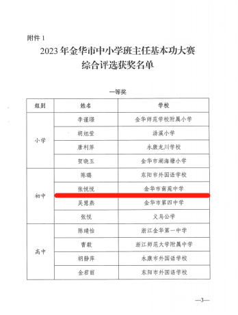 恭喜英文学院2016届英语(师范)专业校友张悦悦荣获金华市中小学班主任基本功大赛一等奖!