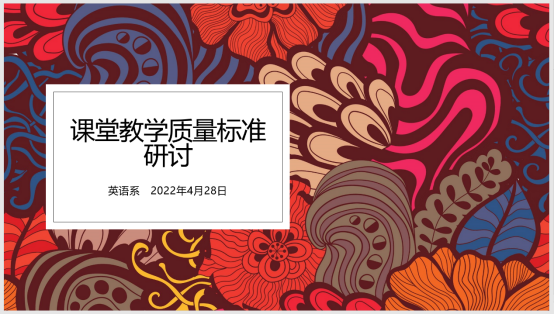 2022年4月28日,英语系课堂教学质量标准研讨会在线上召开。英文学院院长叶狂教授、党总支书记毛立峰、副院长陶伟副教授、系主任黄艳春副教授,英语系全体教师参加会议。会议由系主任黄艳春主持。