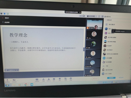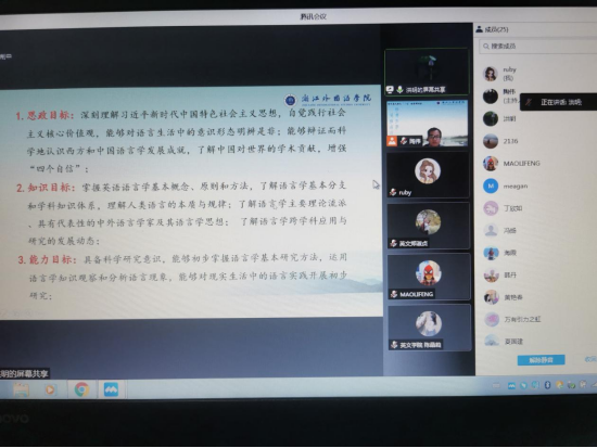 4月14日下午,英文学院召开课程思政教学研讨会(线上),会议由陶伟副院长主持,学院12个“三进”项目组参与汇报,蒙兴灿教授和督导陆海霞老师进行点评,教务处领导、英文学院全体教师参加会议。