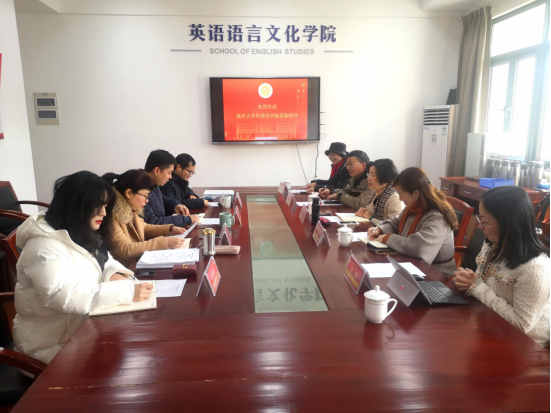 2月24日,温州大学外国语学院院长叶苗一行5人来 国产av 学习调研。英文学院党总支书记毛立峰、科研副院长郑淑贞、教学副院长陶伟、英语系主任黄艳春对来访的老师表示了诚挚的欢迎,并对学院的基本情况做了介绍。