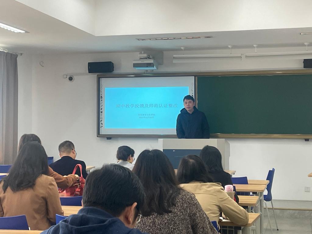 召开全体教职工大会,集中通报期中教学反馈情况并对英语(师范)专业预认证工作中存在的问题和改进措施作简要说明。会议由院党总支部书记毛立峰主持,学院全体教职工共同参与此次会议。