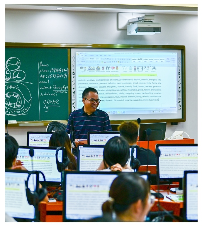 童红灯老师的《综合英语》课程。“英语专业同学的核心素养有哪些?”“综合英语课程学习的目标是什么?”课上,洪校长听得专注,记得详细,查看了课程教材,关注同学们的小组讨论、口语发音等学习情况。洪校长对童老师的课堂教学方式等予以肯定,并就课程的安排、教材的选择等进行了沟通交流。