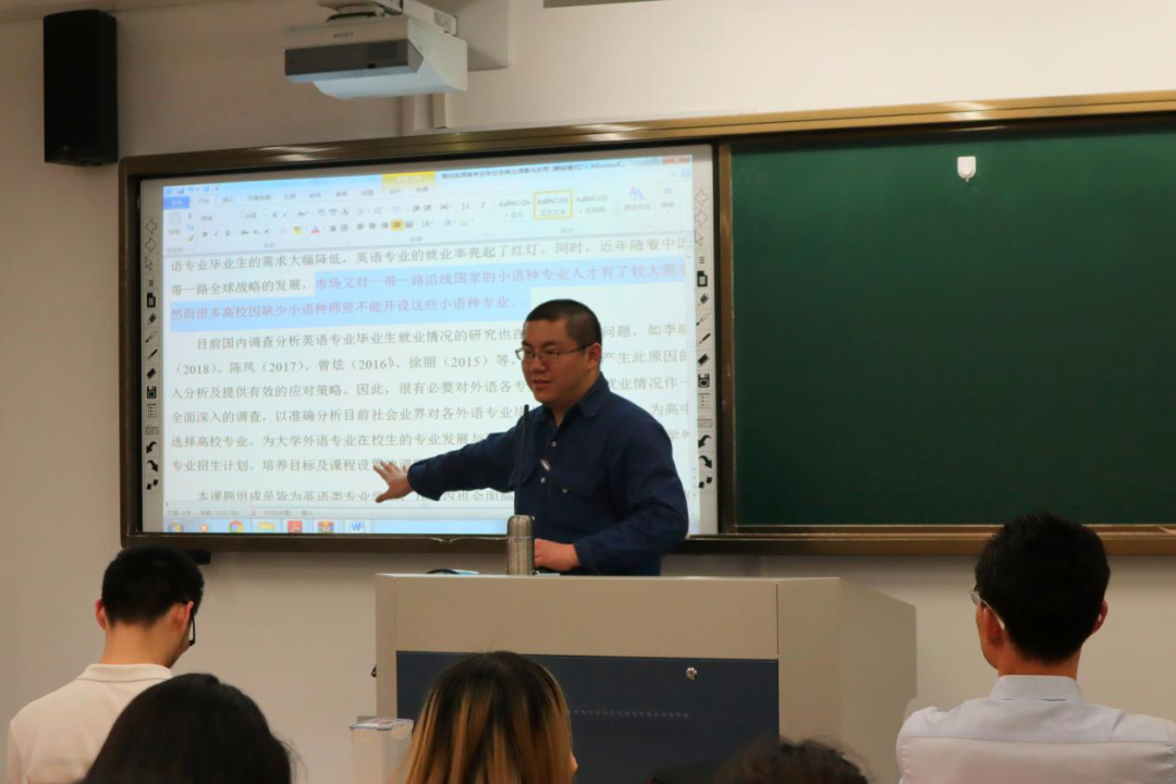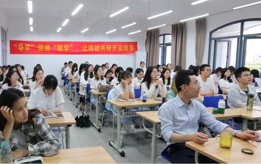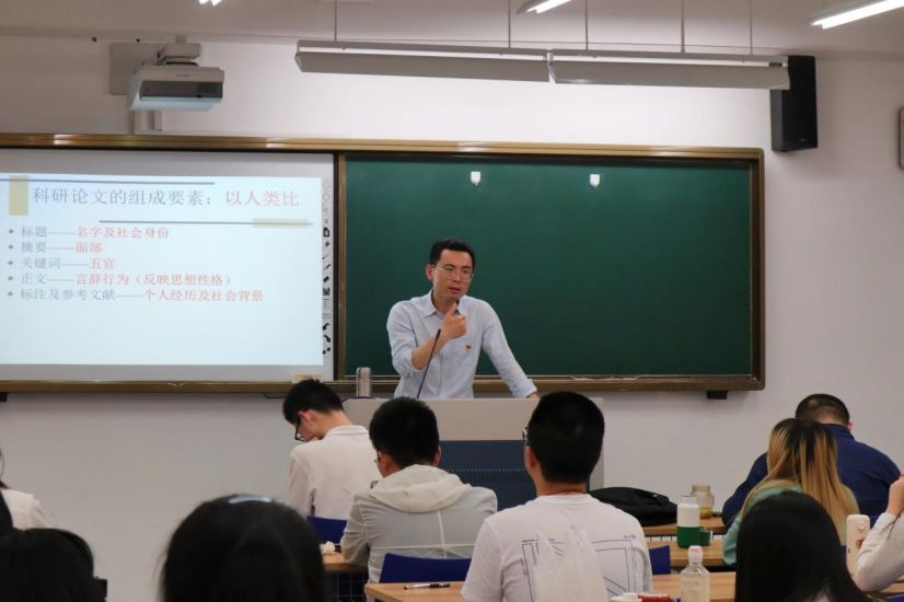 “科研论文就和我们人一样,论文标题就像人的名字和社会身份,摘要就像人的面部,通过摘要就能了解论文的大致方向内容,关键词就是脸上的五官,正文就是能反映人思想性格的言辞行为,而标注及参考文献就是个人经历和社会背景……在融院A101教室,来自英文学院教工党支部书记何习尧老师正在通过生动的比喻向同学们讲解如何进行科研论文写作,他通过论文写作来向同学们传达“学写作 学做人”的思想。