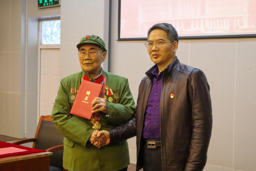 随后,院长蒙兴灿向郝龙清老人颁发红色导师特聘证书,浙江新四军历史研究会浙西分会副会长王培佩会长向师生党员代表赠书。