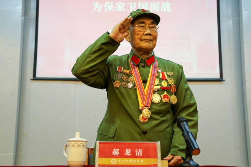 “听老党员讲党课”阶段,学院党总支邀请到浙江新四军历史研究会特邀宣讲员郝龙清老人作题为“为保家卫国而战”专题报告。92岁高龄的郝龙清老人,1947年加入中国共产党,在陆军服役8年,空军服役27年,开过战斗机、轰炸机、运输机,曾参加过抗日战争、解放战争、抗美援朝战争等战斗战役,是一名在战争中多次立功受奖的老革命。