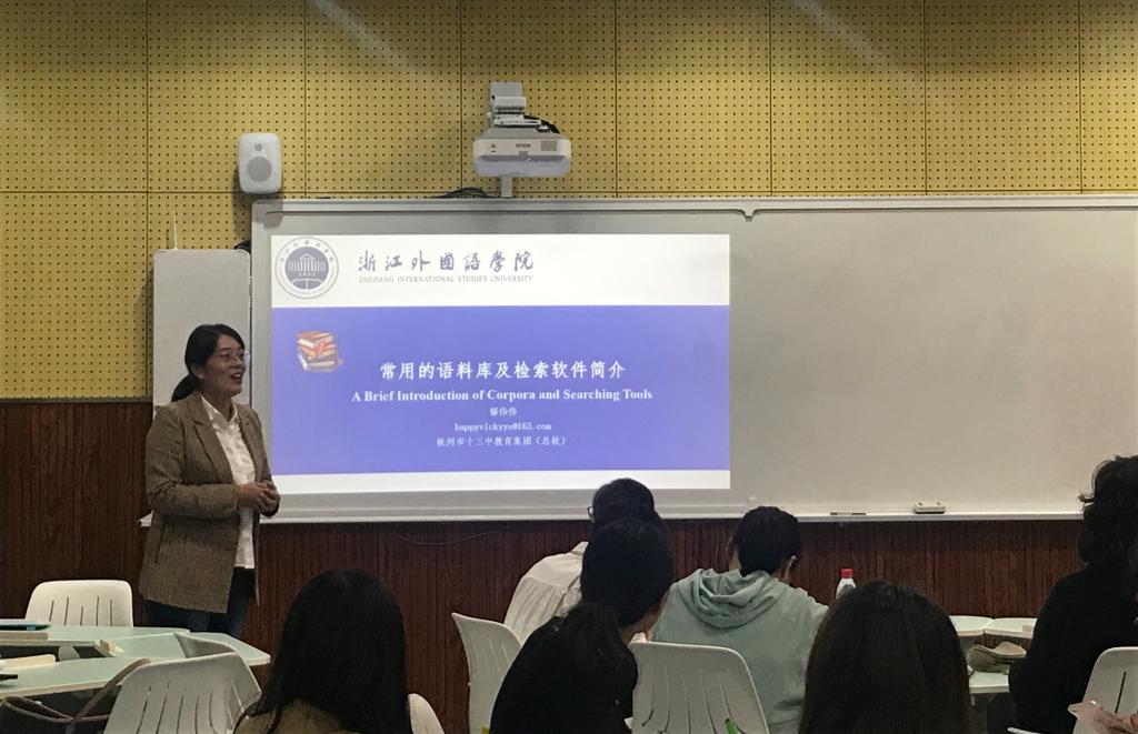 驻杭州市十三中教育集团博士工作站驻站博士之一,在十三中图书馆做了“常用语料库及检索软件简介”专题讲座,十三中英语教研组全体教师和学院英语师范专业实习生现场聆听讲座。