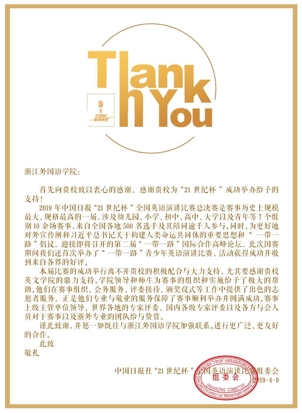 英文学院,感谢英文学院领导和师生为2019年中国日报“21世界杯”全国英语演讲比赛总决赛的组织和实施给予极大帮助。