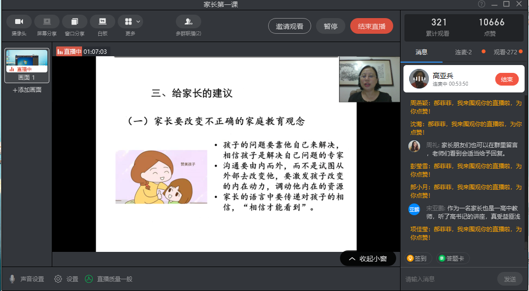 活动伊始,高教授以案例引入,告知家长大学生进入大学后的三个适应性问题:学习适应性问题、心理健康问题、人际适应性问题。其后,高教授从家庭教育入手,以教育观念、教育方式出发,告知家长如何向孩子传达相信,接纳孩子,学会倾听,给孩子的情绪一个出口,提高与孩子之间的沟通,提升有效教育质量。最后,高教授表示,家长要重视与国产av
