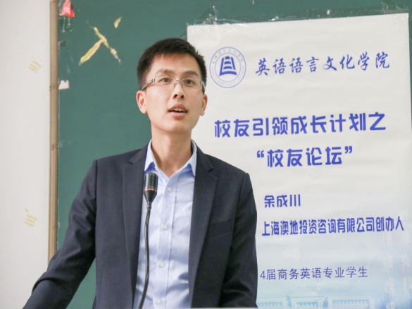 余成川校友曾是国家助学金的获得者,于返校日回校,不仅是为了表达对社会、对母校的感激之情,更多的是为了与在校的英文学子们分享他的创业心得。