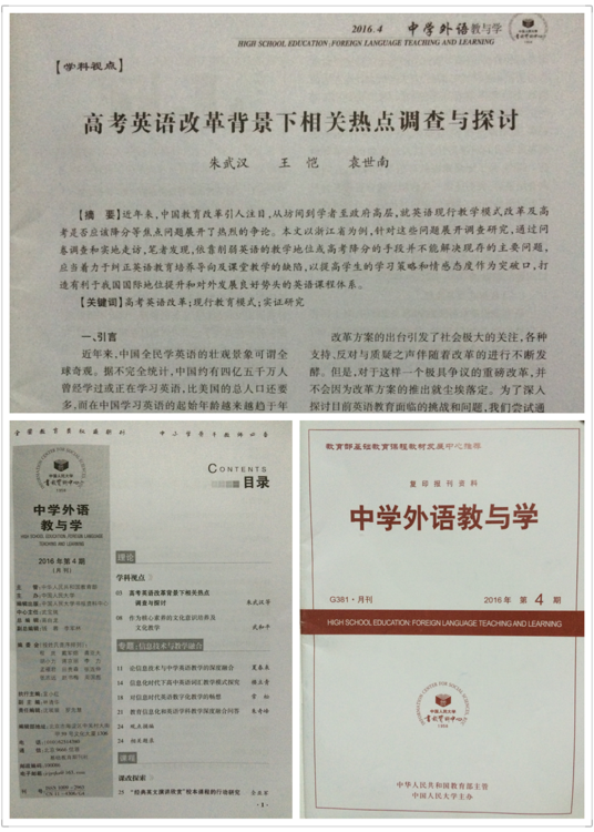 日前,由英文学院英语系朱武汉博士、2012级英语师范专业学生王恺、袁世南共同撰写的题为“高考英语改革背景下相关热点调查与探讨”一文荣获由全国基础外语教育研究培训中心、《基础外语教育》编辑部联合主办的第十一届“新标准杯”基础英语教育教学论文大赛一等奖。论文在《基础外语教育》2015年12月双月刊上刊印。2016年4月,教育部主管、中国人民大学主办的国家级核心期刊《中学外语教与学》全文转载刊登该论文。这是英语师范专业师生在论文领域斩获的一项殊荣。