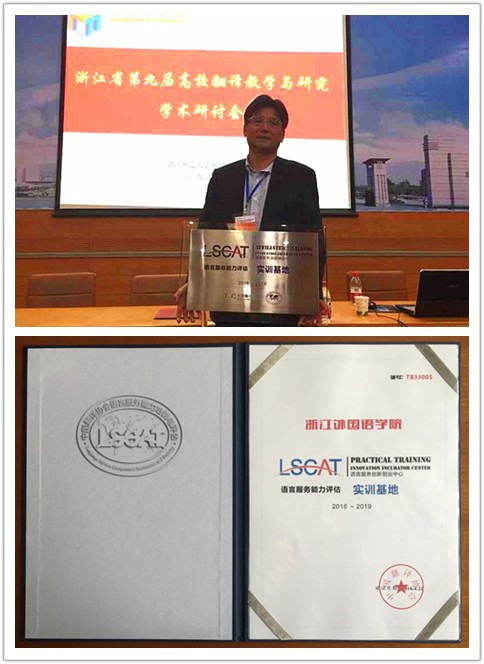参加了授牌仪式。该基地由中国翻译协会LSCAT(Language Service Competence Assessment and Training)语言服务能力培训与评估中心授予。评估中心是在中国外文局、中国翻译协会、MTI教指委指导下实施的语言服务业人才综合培养平台,旨在推广及实施语言服务业标准,构建并发展面向全社会的、以应用能力为导向的语言服务行业复合型人才培养、管理和服务平台。目前全国有多家企业和多所高校加入了平台建设,浙江省全省迄今仅有四所高校获准建立。
