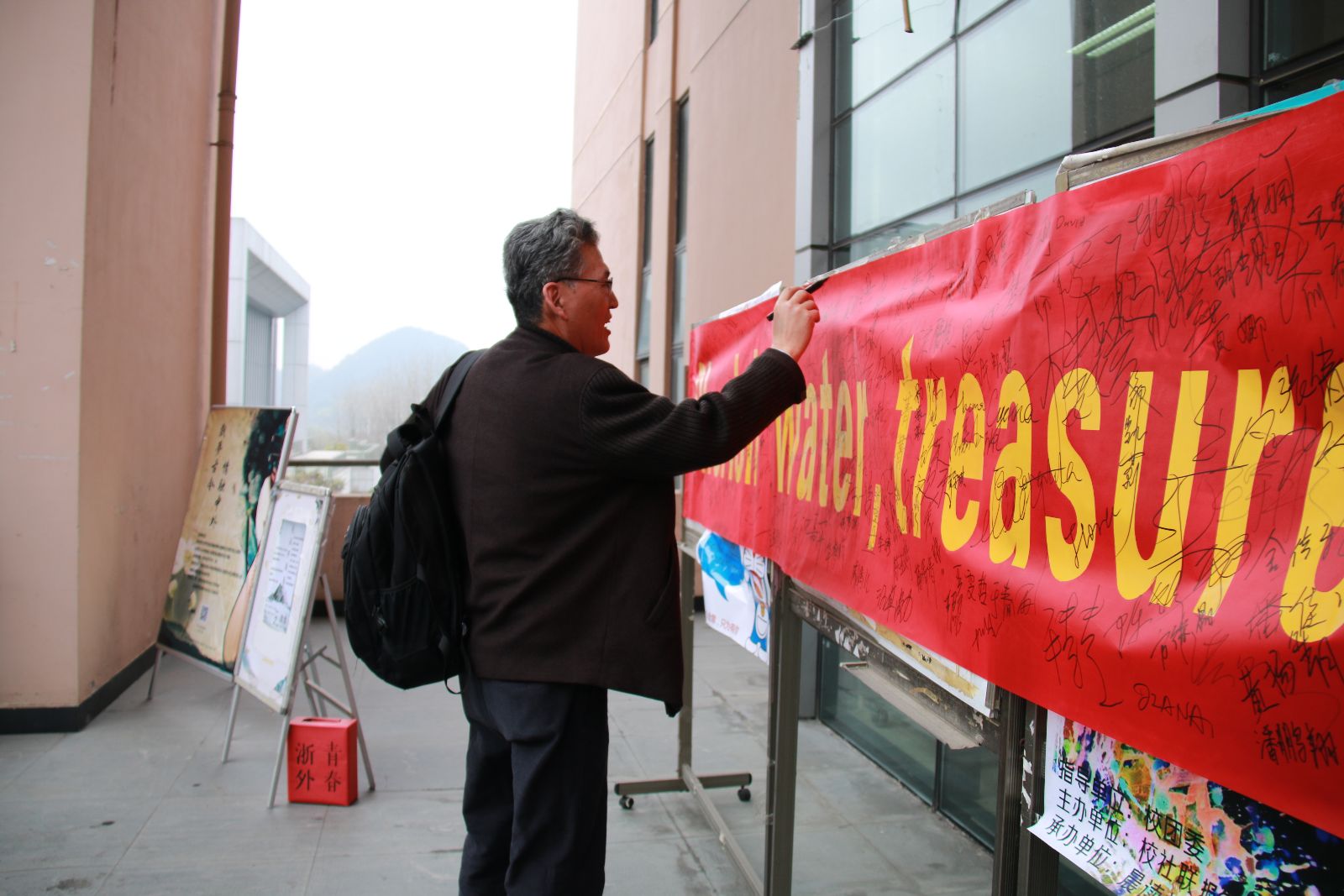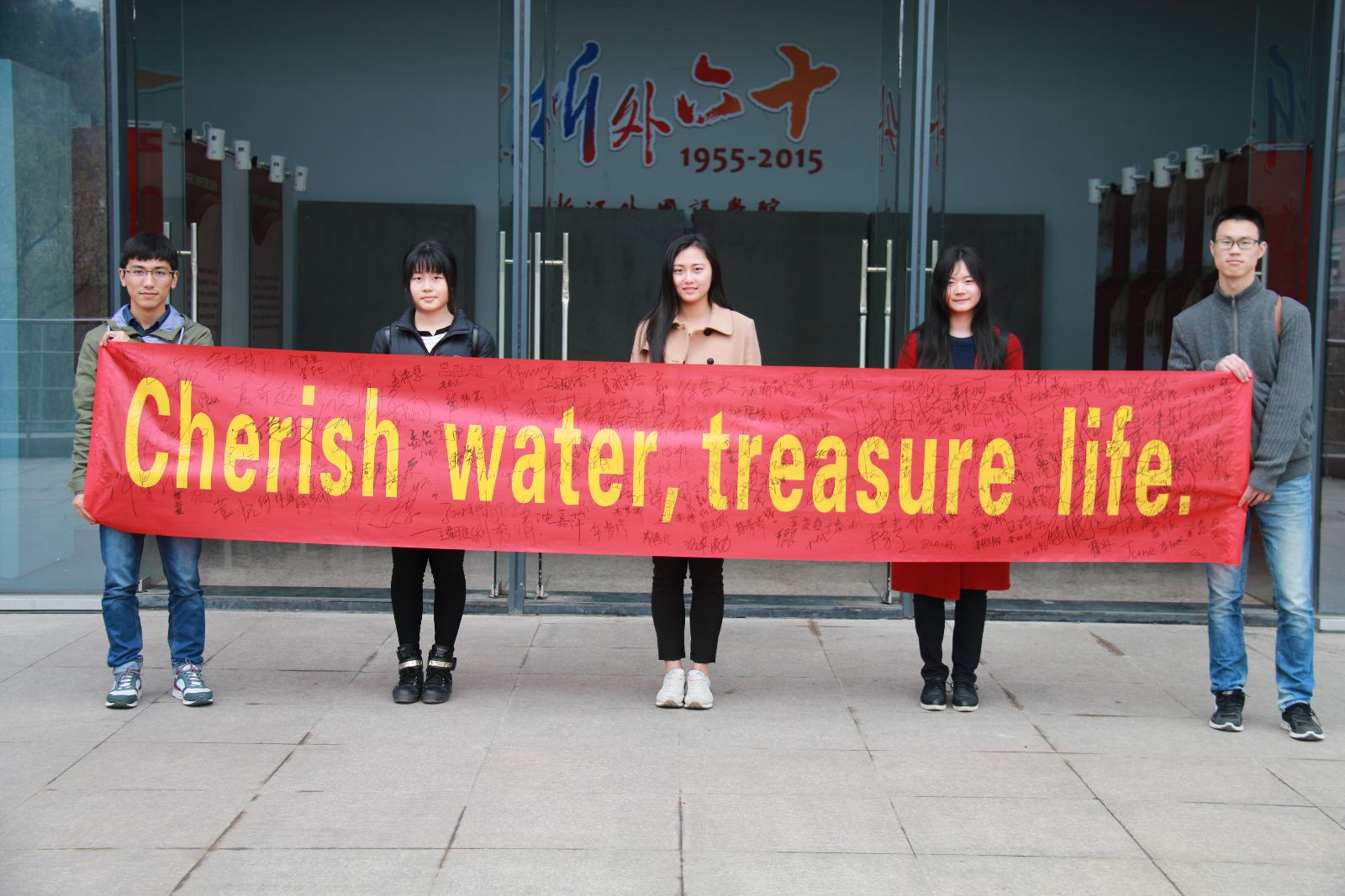 在和畅餐厅门口举办了横幅签名活动。横幅上的“Cherish water, treasure life”标语不断吸引着大家的眼球,同学们纷纷驻足在横幅前,并在横幅上签下自己的名字。