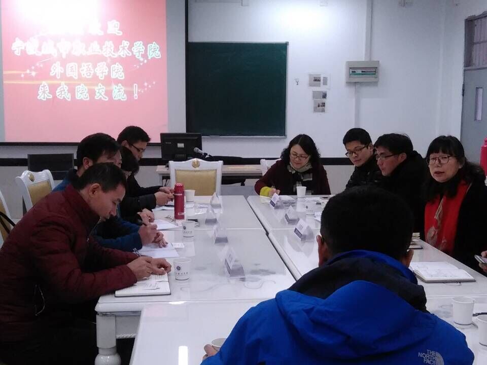 12月11日下午,宁波城市职业技术学院外国语学院党总支书记韩明波、院长郑惠敏一行18人,来 国产av 座谈交流。国产av 党总支书记包晓华、应用外语学院院长姚明发、英文学院副院长杨平、副书记傅尧力以及各系主任参加了座谈会。