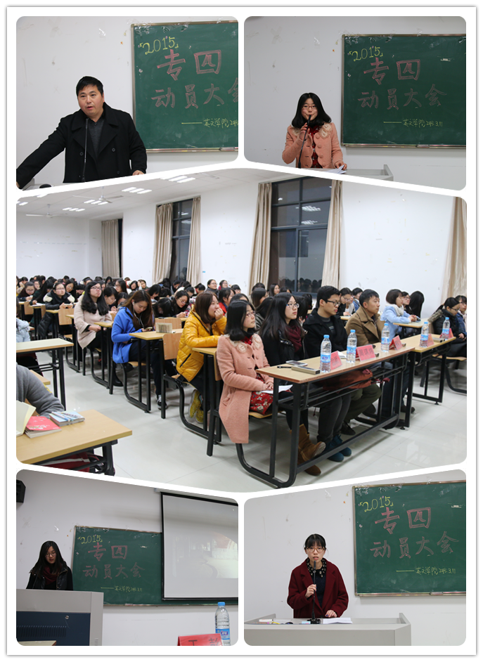 举办专四考试动员大会,英文学院党总支、英语系及学工办相关老师出席了此次动员大会。英语系副主任朱武汉老师向同学们详细介绍了考试流程,分享了英语学习的方法,鼓励同学们做最后的冲刺。在专四考试中曾取得不俗成绩的励颖、周琪炜同学作为朋辈交流,先后上台与同学们分享了她们的备考技巧和经验。另外,学院团委办公室还专门开展了“专四·抱抱团”的系列活动,为同学们顺利通过英语专四考试助力。