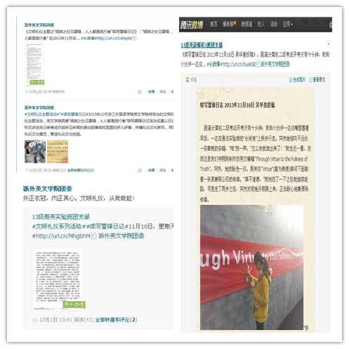 与此同时,英文学院以微博为平台,组织了“细微之处见雷锋,人人都是践行者”——续写雷锋日记活动。该活动以日记的形式讲述自己亲身经历或所见所闻的感动故事以及在校园里发生的好人好事。本次活动得到了英文学院各个团支部的积极响应,微博得到了大量的转载和分享,在网络平台上掀起了传递正能量,营造文明和谐、崇学向善的良好风气。