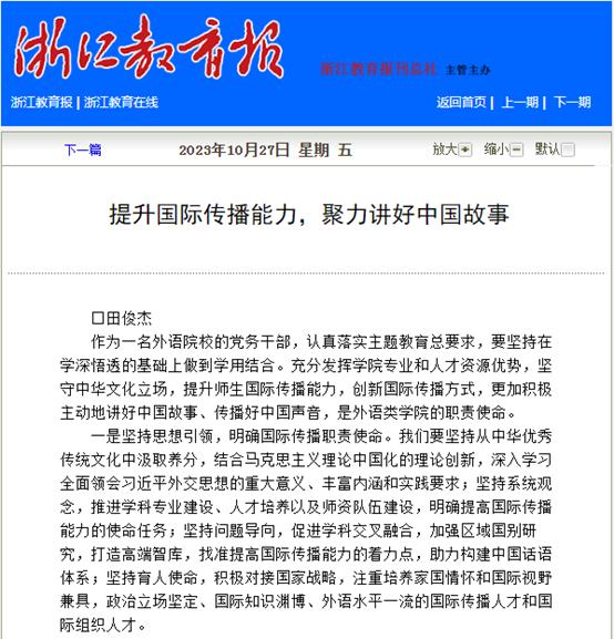10月27日,浙江教育报以《提升国际传播能力,聚力讲好中国故事》为题,报道了英文学院党总支书记田俊杰老师的理论文章。