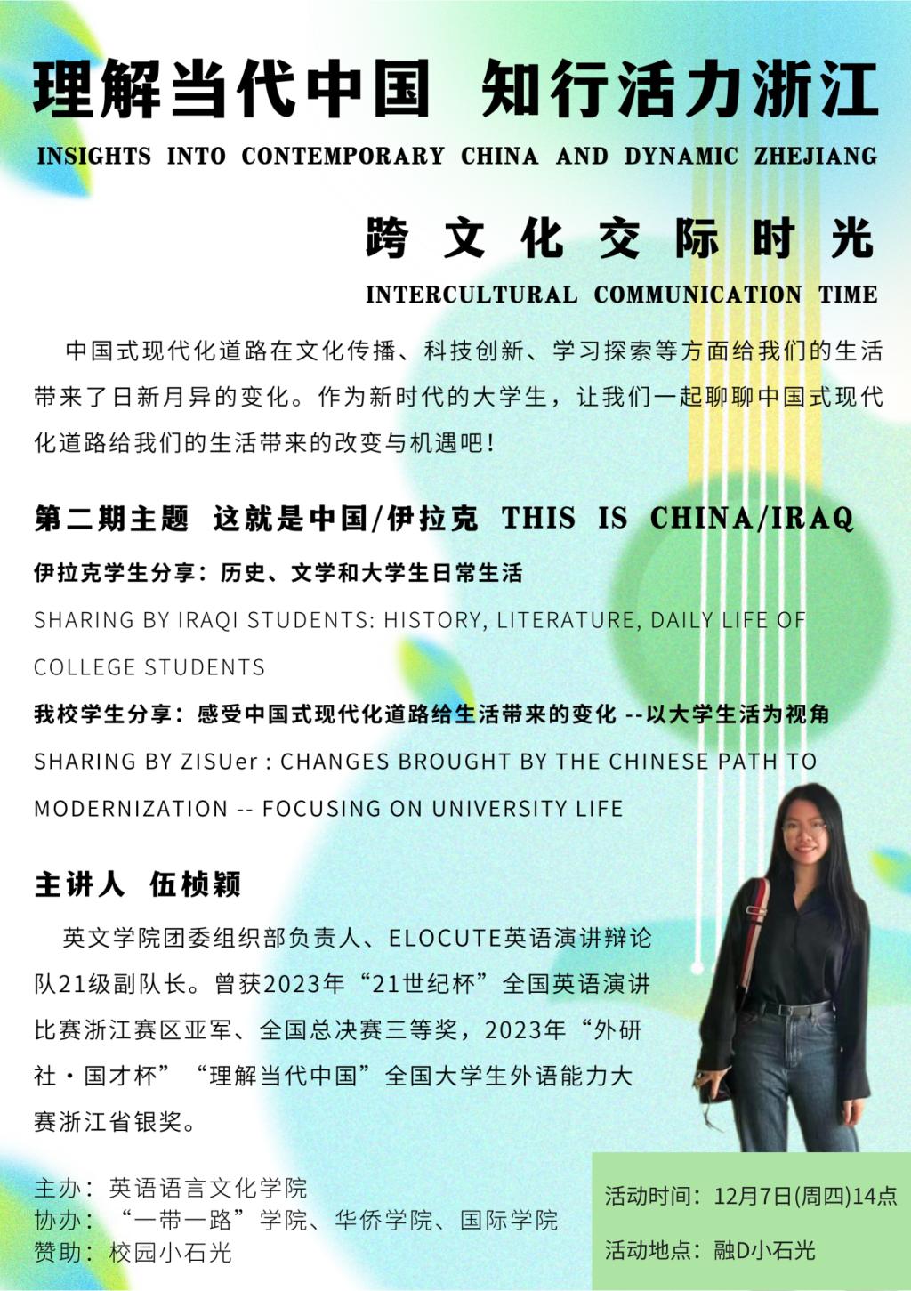 为弘扬“闻道中华 语美天下”的浙外精神,助力青年学生深入理解当代中国,知行活力浙江,讲好中国故事、浙江故事,传播好中国声音、浙江声音,英文学院在校园小石光开展“跨文化交际时光”系列活动,活动第一期已于11月23日顺利举行,反响热烈。第二期,英文学院将结对伊拉克新汉大学,线上开展国际青年交流。讲述中国式现代化发展在文化传播、科技创新、学习探索等方面所带来的变化;介绍有关伊拉克历史、文学和大学生日常生活的情况。
