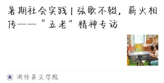 近日,由英文学院21口译班李俊林、林茈晗,22口译班余慧茹,22法语2班郭静婷等同学组成的知行合一“五老”访谈实践团队的作品《三尺讲台筑银魂 蜡炬始燃照边疆》入选浙江省教育系统“读懂中国”优秀微视频。