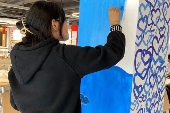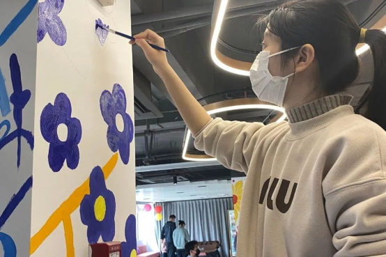 雷锋三月,草长莺飞,万物复苏,英文学院青春自强“521”行动之守护童心小组的15名志愿者前往四季五福幸福邻里坊展开“‘童’心‘童’行,守护成长”志愿活动,他们用画笔协助绘制宣传画卷和墙壁彩绘,丰富了童心学院的文化空间。