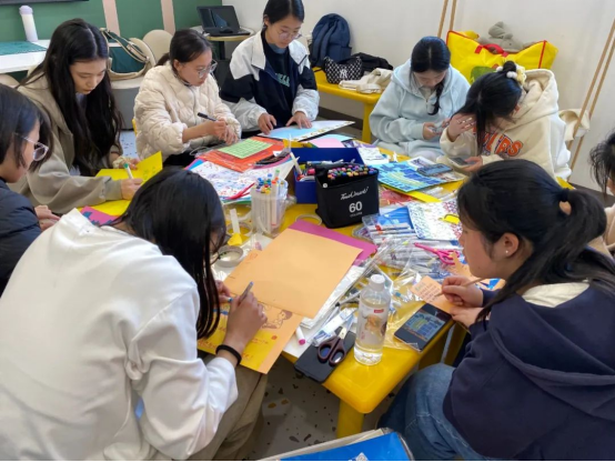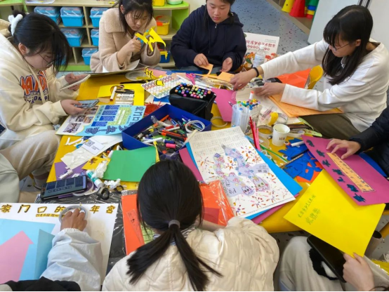 另一只小队围坐在圆桌旁,有人拿着画笔、写字、绘画,制作宣传海报,有人拿着剪刀进行裁剪,每个人都认真专注于手上的工作,力求做到更好,最大化地完善童心学院的宣传作品,让童心学院的各项活动得以更好的传播。